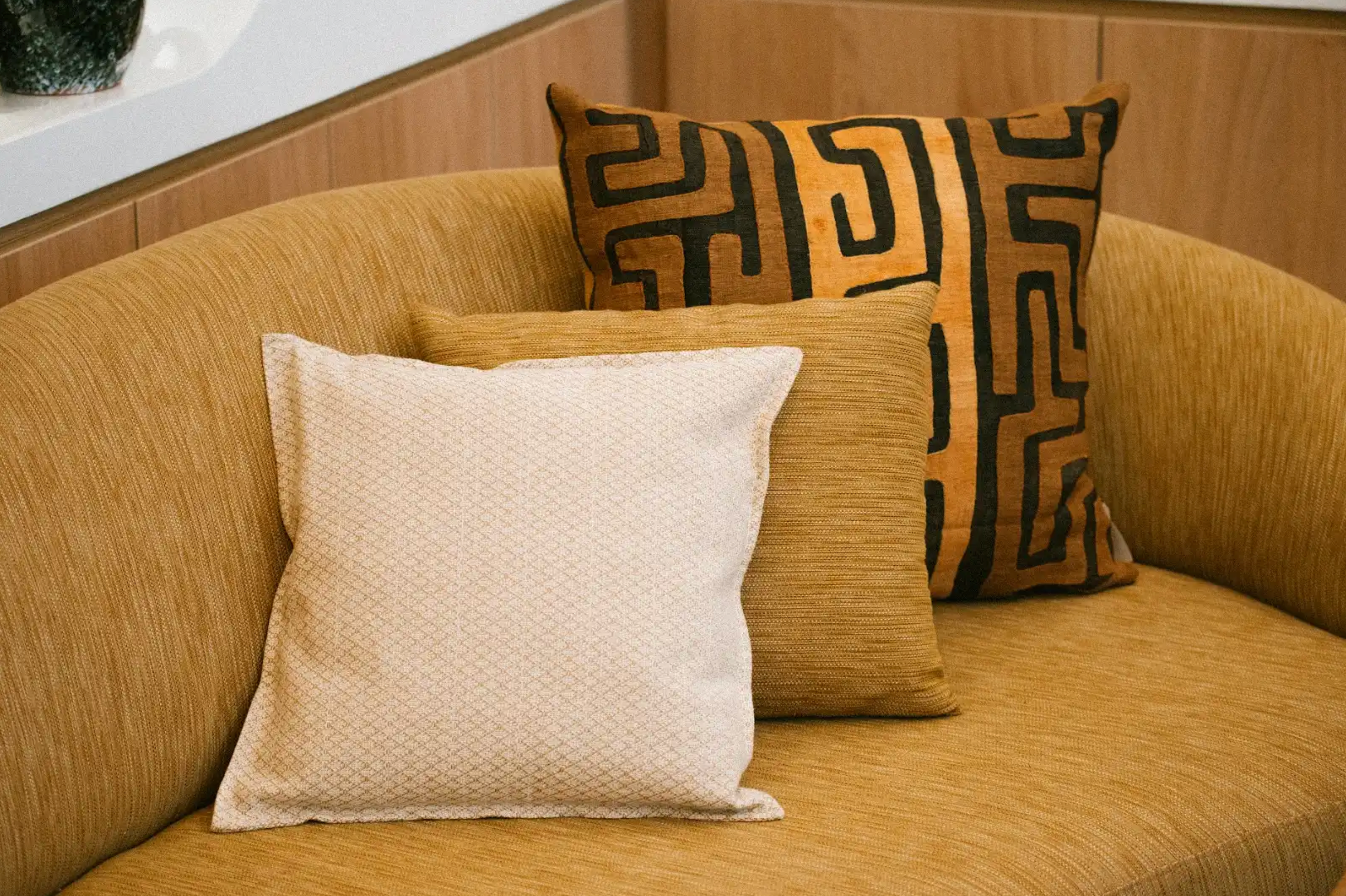 Laissez-vous tenter par nos coussins Ntshak en raphia tissé main de République Démocratique du Congo; nos coussins en coton tissé main au Ghana et ceux en coton teint naturellement en République de Guinée. Jouez avec les couleurs, superposez les matières pour un salon plus accueillant ou une chambre plus apaisante.